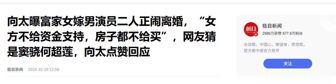 【2】极目新闻 2025-10-19 向太曝富家女嫁男演员二人正闹离婚,“女方不给资金支持,房子都不给买”,网友猜是窦骁何超莲,向太点赞回应
