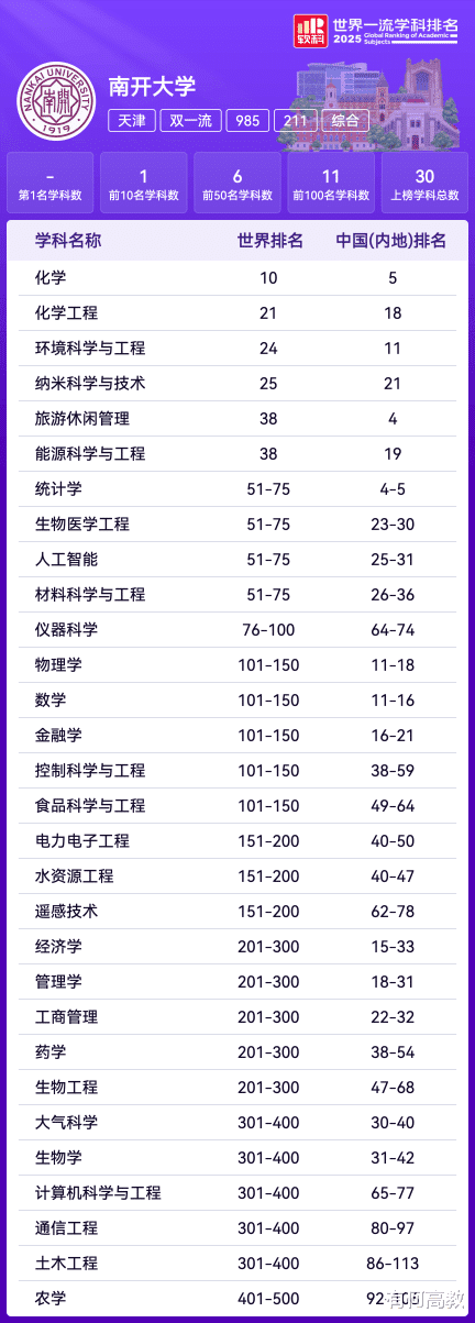 那么,这份精神在和平发展的今天,演化成了怎样的“硬核”实力呢?答案藏在实实在在的数据和成果里。如今的南开,是一所“文武双全”的综合性研究型大学。它的传统理科优势极为耀眼,根据2025年软科世界一流学科排名,其化学学科稳居全球前10,在国内的顶尖学科排名中高居第2。
