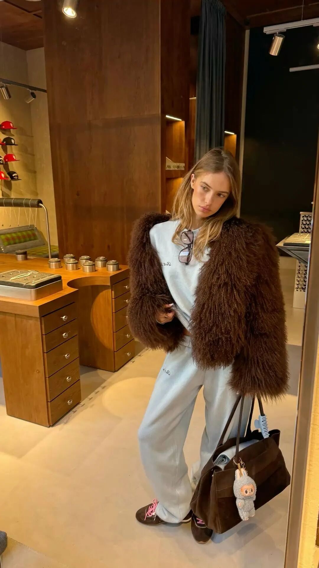 皮草不用费力叠穿,往肩上一搭就有层次,浅灰运动套装中和皮草的华丽感,把慵懒刻进 DNA 里,复古板鞋和玩偶挂饰增加松弛感。