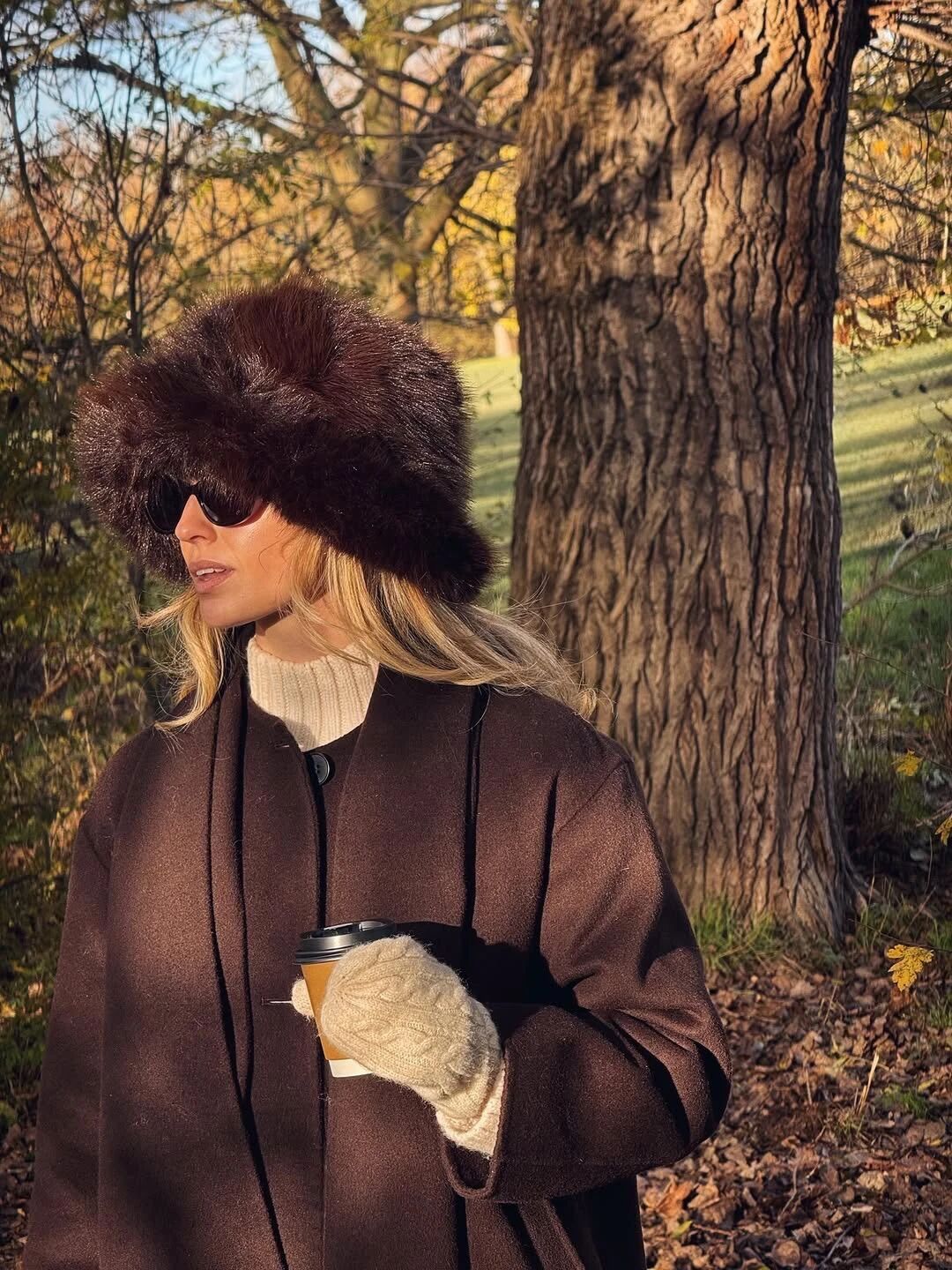 不同于黑色的冷峻、驼色的挑人,深棕自带「松弛高级感」, 像融化的巧克力,像烤得暖烘烘的壁炉,把秋冬的慵懒与温柔都裹在身上。