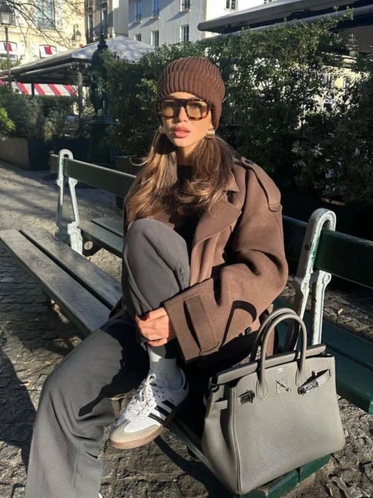 宽松大衣配宽松阔腿裤,是不费力的慵懒感;棕色冷帽和大衣同色系呼应,墨镜一戴,谁都不爱;手里的灰色铂金包又添了几分贵气,休闲也能穿出高级感。
