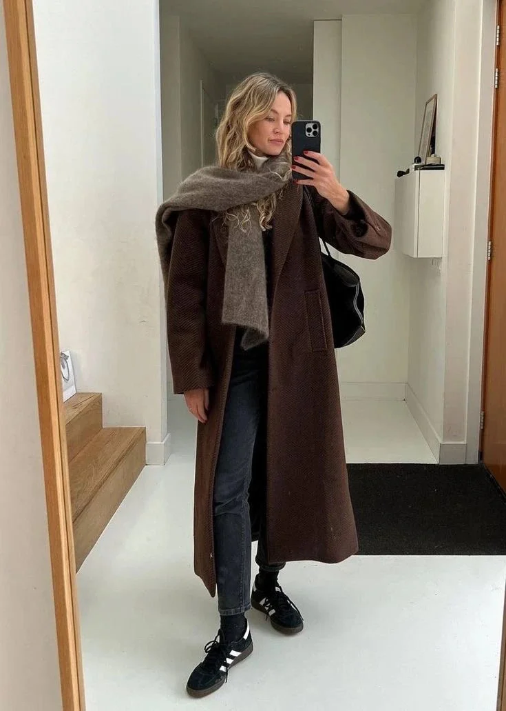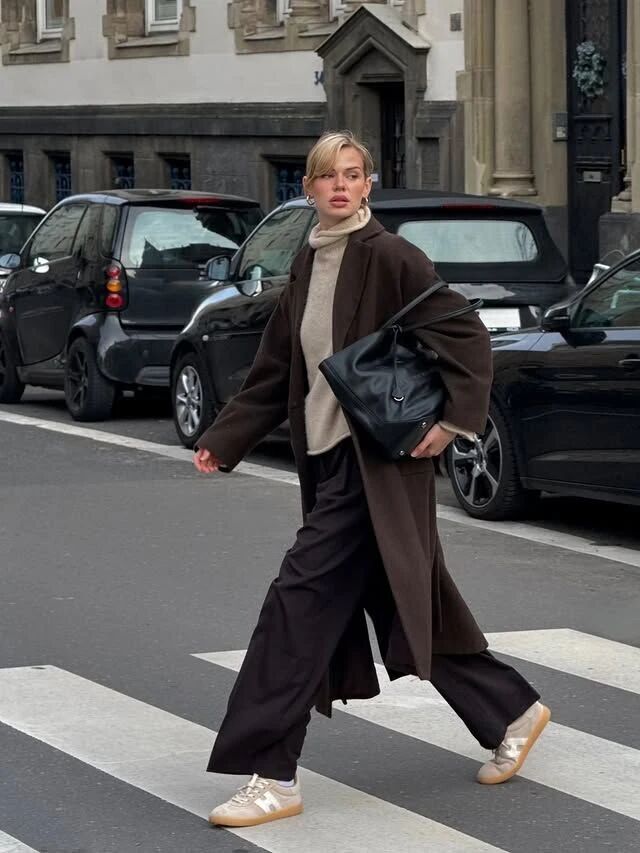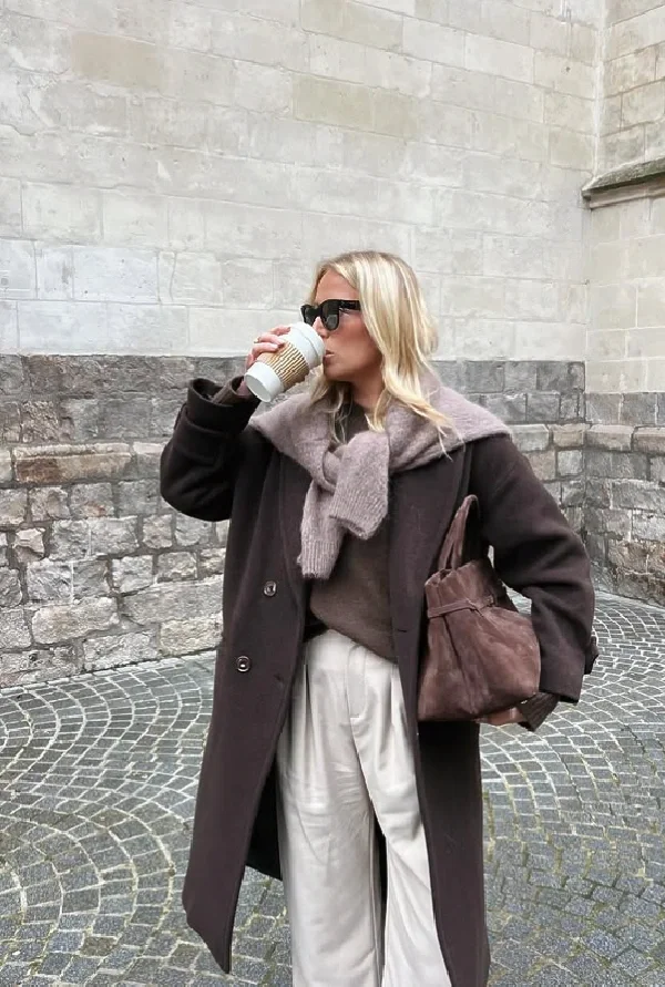 同色系搭配是显高级的小技巧,深棕外套 + 阔腿裤的组合,视觉上拉长比例,围巾一体设计保暖又时髦。
