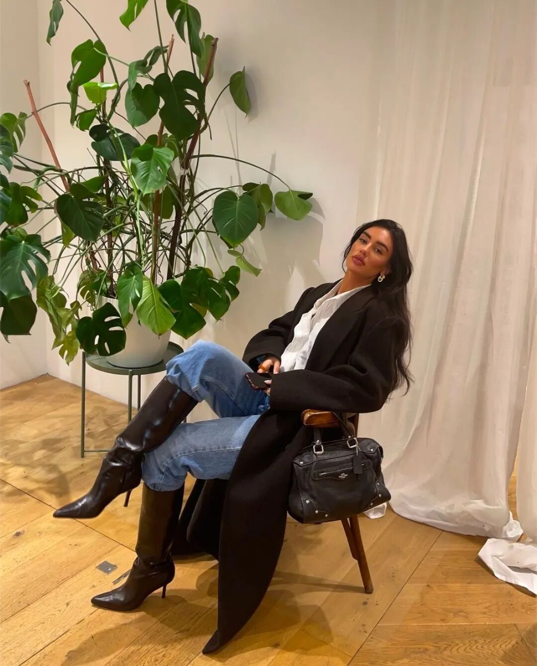 极简配色永远不出错!黑色内搭 + 微喇牛仔裤,勾勒身材曲线,超长款大衣一披,气场直接两米八。尖头高跟靴拉长小腿线条,即使穿大衣也不会显臃肿。