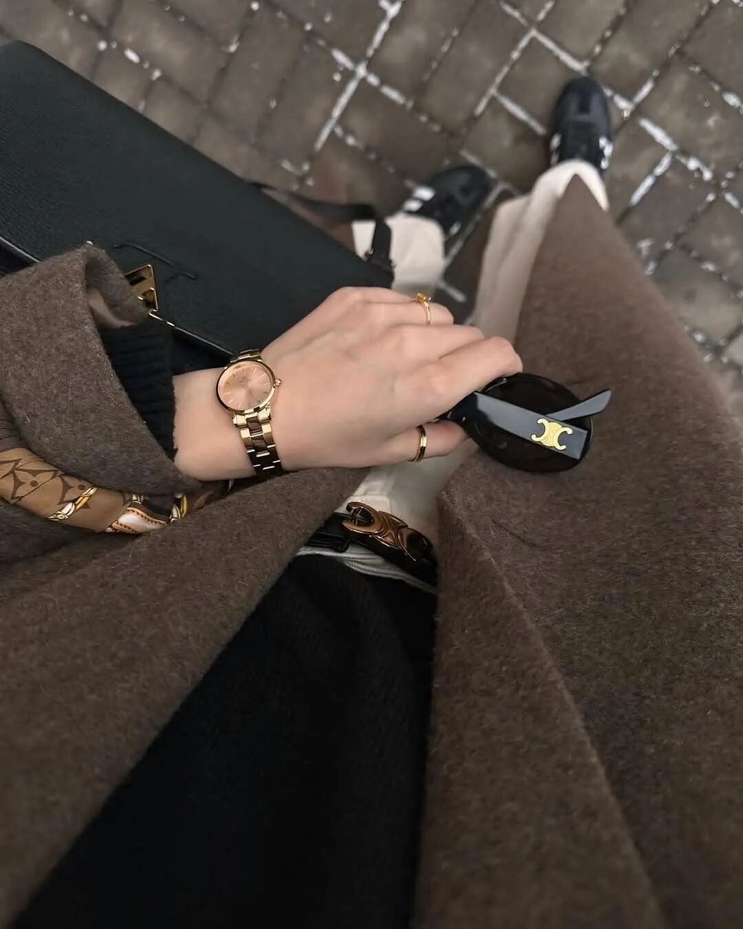 金色是深棕的绝佳拍档!手表的金色表盘、包包的金色扣饰、丝巾的金色花纹,都能提升整体造型的精致度。大衣袖口露出的丝巾和手表,手里的墨镜和金色戒指,都是贵气感的来源。