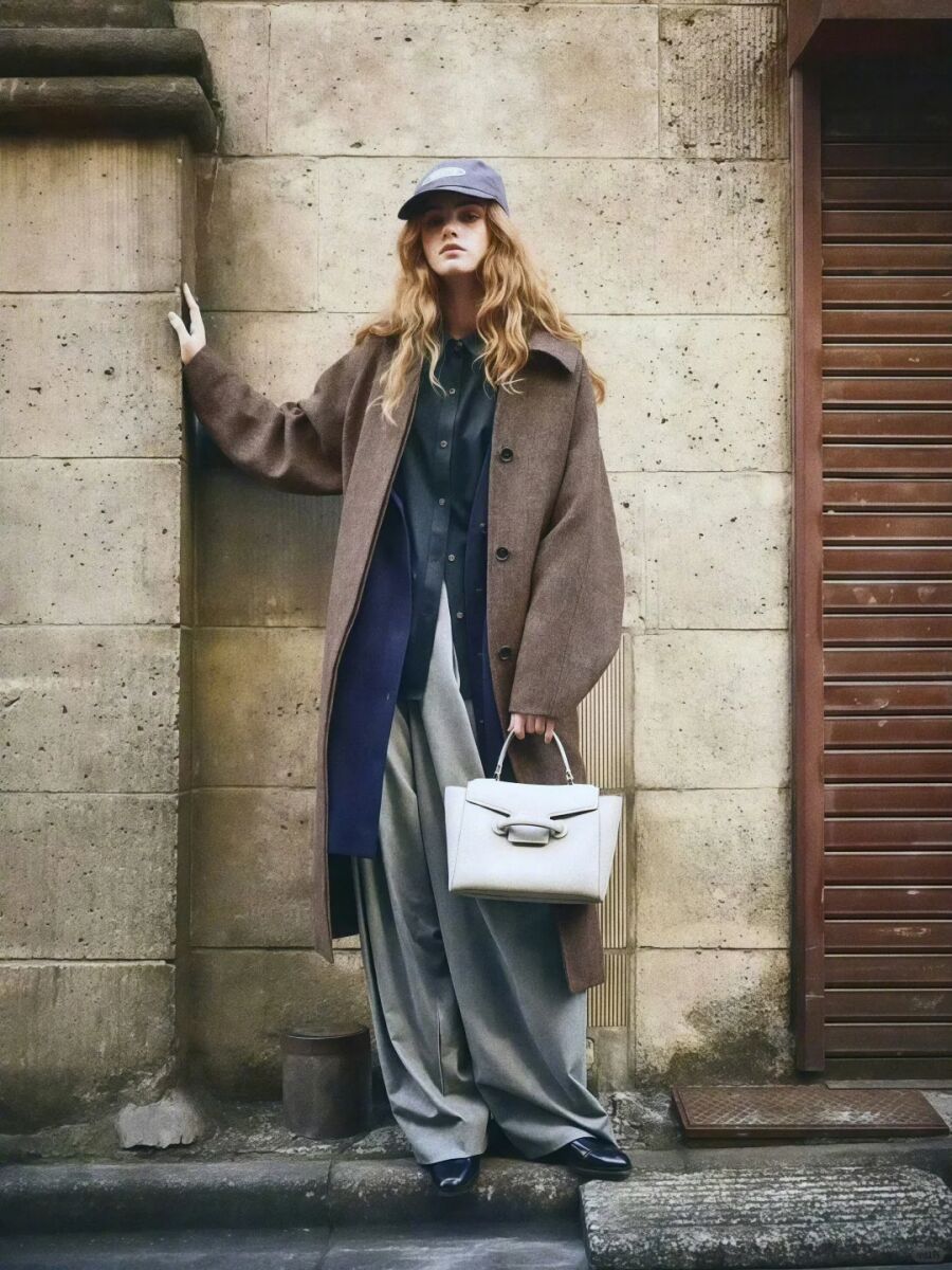 叠穿是秋冬的灵魂!内搭选深色衬衫 + 藏青马甲,层次感拉满,还能应对室内外温差。浅灰阔腿裤垂感十足,走路时裤脚轻轻扫过鞋面,自带复古滤镜。棒球帽和白色手提包是点睛之笔,中和大衣的成熟感。