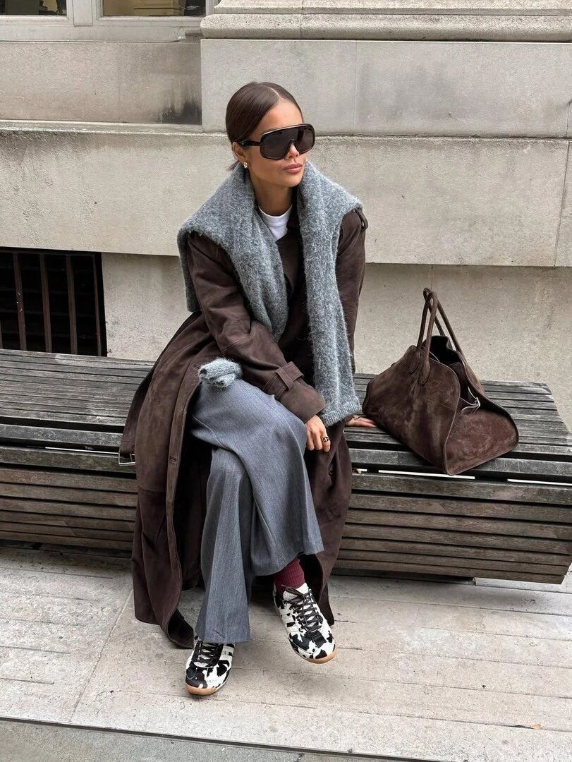 灰色针织披肩自带 “毛茸茸滤镜”,和大衣的硬挺材质形成对比;灰色阔腿裤垂感十足,走路时裤脚扫过地面,复古又文艺;奶牛纹鞋子是整套的点睛之笔,打破深色的沉闷。