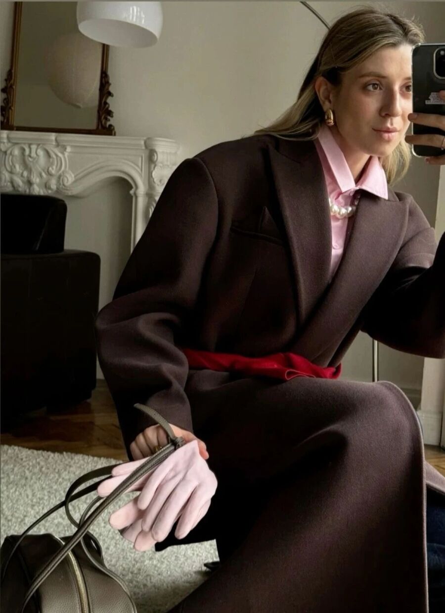 粉色衬衫与红色腰带的撞色,打破深棕的沉闷,把「甜酷感」焊在身上。珍珠项链与粉色手套增加复古精致感。