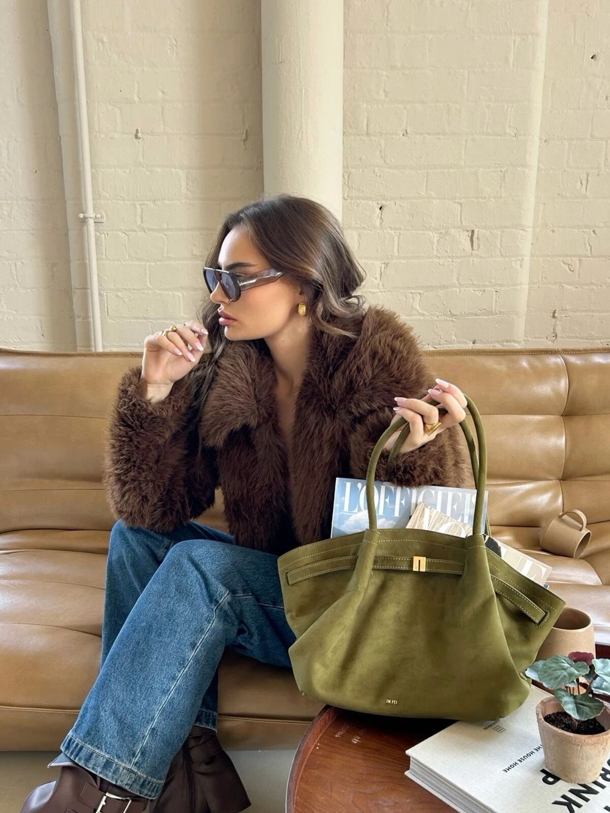 短款皮草是小个子的福音,高腰牛仔裤 + 厚底短靴的组合,视觉上拉长比例,把 “上宽下窄” 的辣妹比例焊在身上。橄榄绿托特包是点睛之笔,绒面材质与皮草呼应,复古感直接拉满。