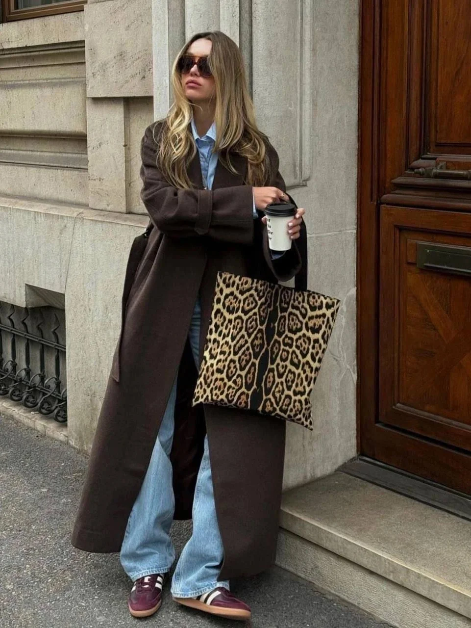 内搭选白衬衫 / 浅蓝衬衫,解开两颗扣子增加随性,大衣敞开穿露出层次感,腰带是点睛之笔!浅棕大衣 + 浅蓝围巾 + 棕色腰带的组合,视觉上强调腰线,避免宽松版型显臃肿。深棕大衣 + 豹纹托特包的碰撞,打破通勤的沉闷。