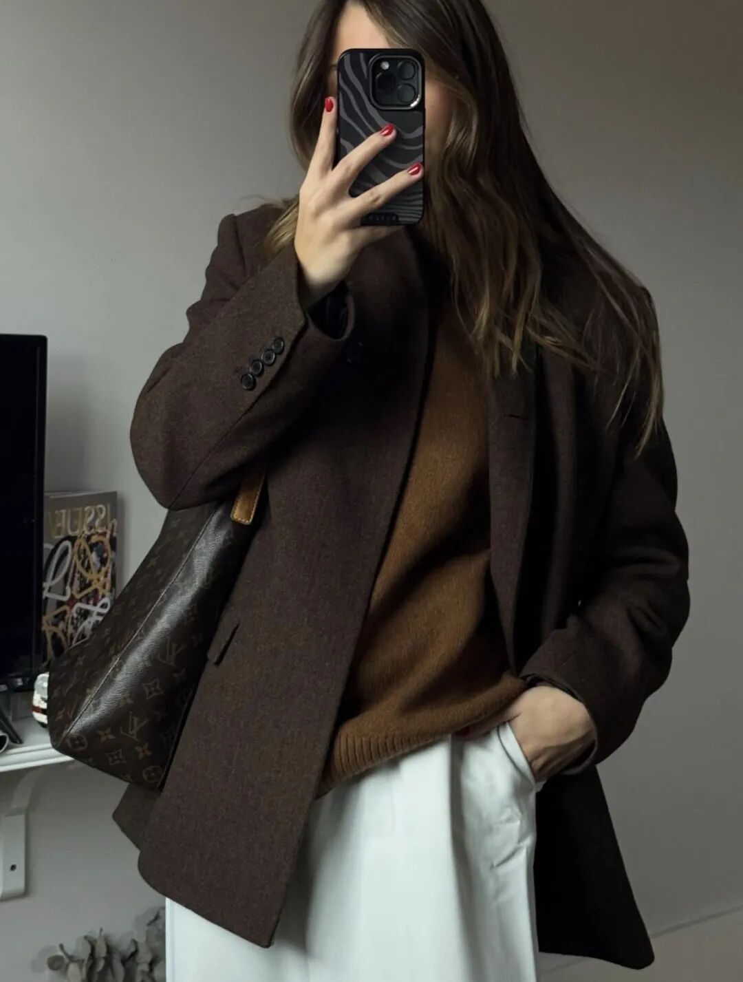 深棕大衣 + 焦糖内搭 + 浅米阔腿裤,色调柔和又有层次。白色半裙提亮整体造型,中和深色的厚重感,适