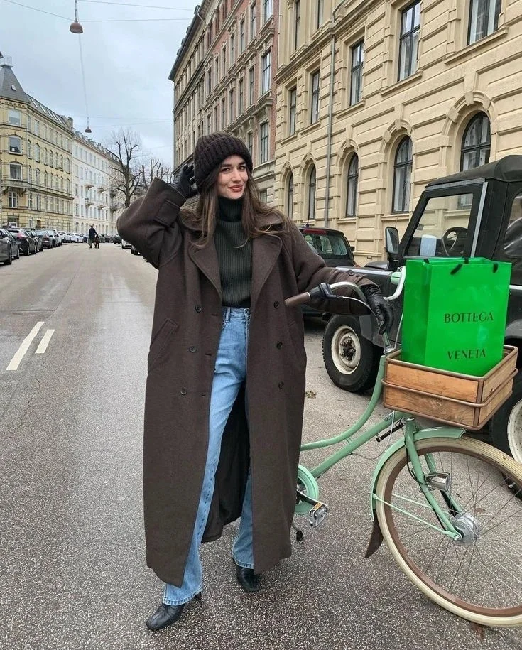 冷帽与手套的组合,把秋冬的氛围感直接拉满,骑车通勤也能保暖又时髦。浅蓝牛仔裤中和大衣的厚重感,视觉上更显轻盈。