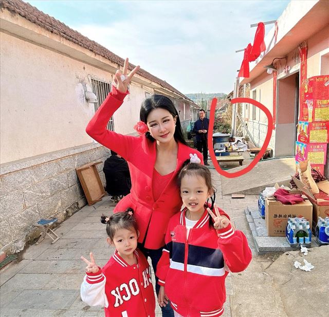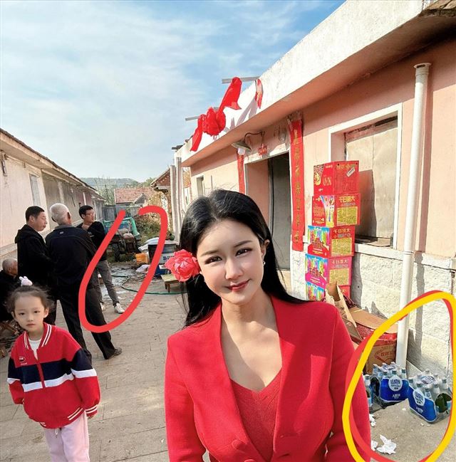 婚礼的地点摆设在农村的小巷子中,张暖雅并没有选择传统的婚纱,而是身穿一件大红色的上衣,搭配着蓝色牛仔裤,头上还别了一朵红鲜花。