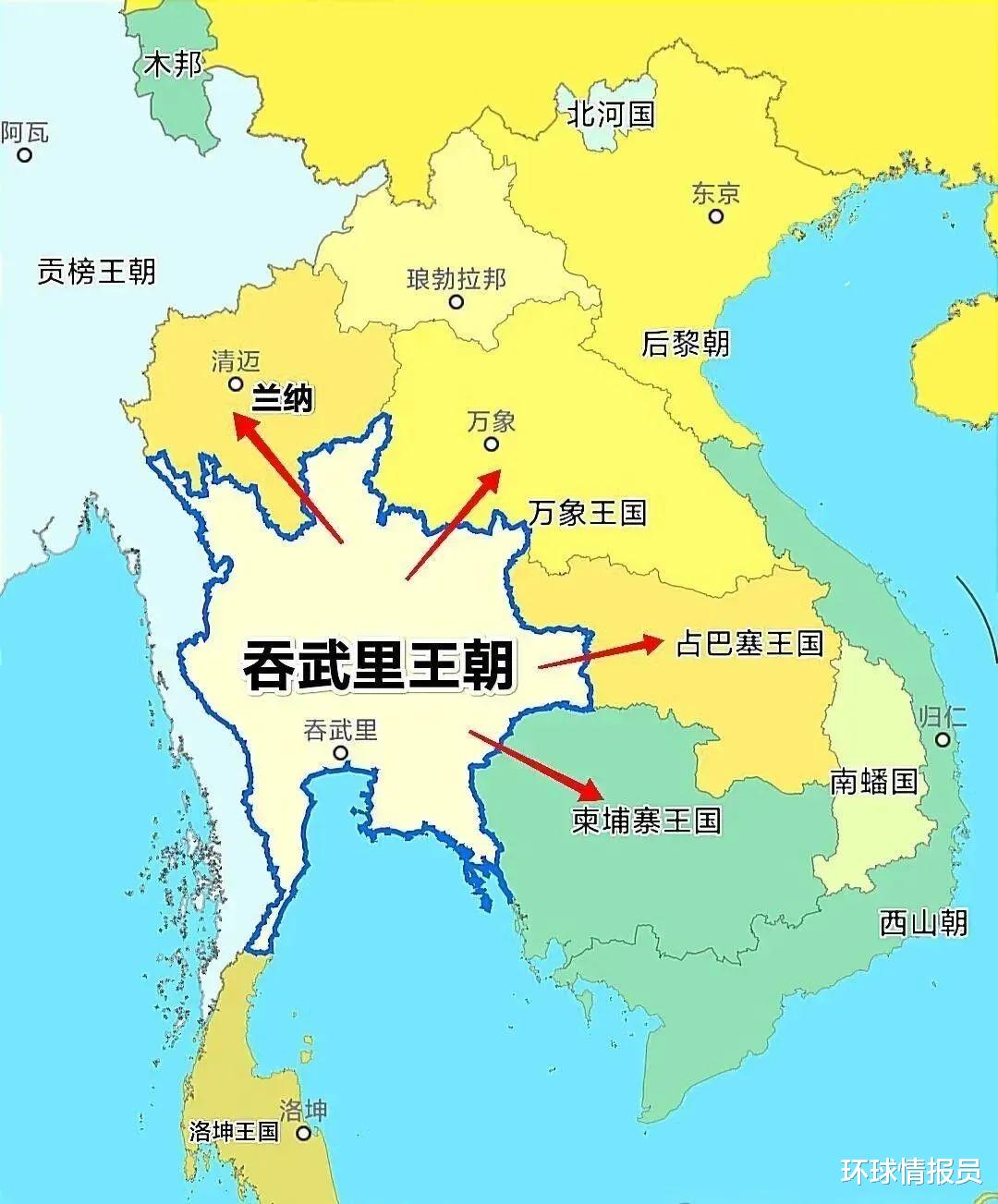 1558年,缅甸先是吞并了靠北的兰纳王国。1560年,又继续向东进攻澜沧王朝,迫使其成为缅甸的藩属国。