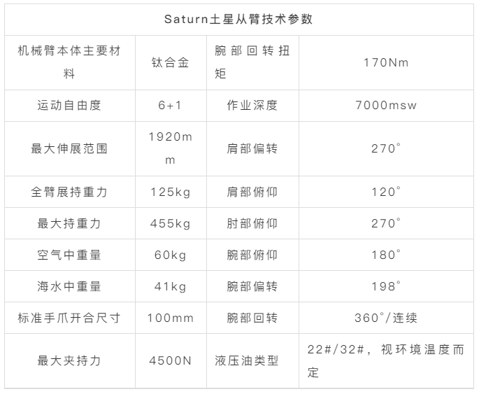 大范围作业能力:最大伸展范围1.92米,全臂展持重125kg,支持深海设备安装、重物搬运等任务。