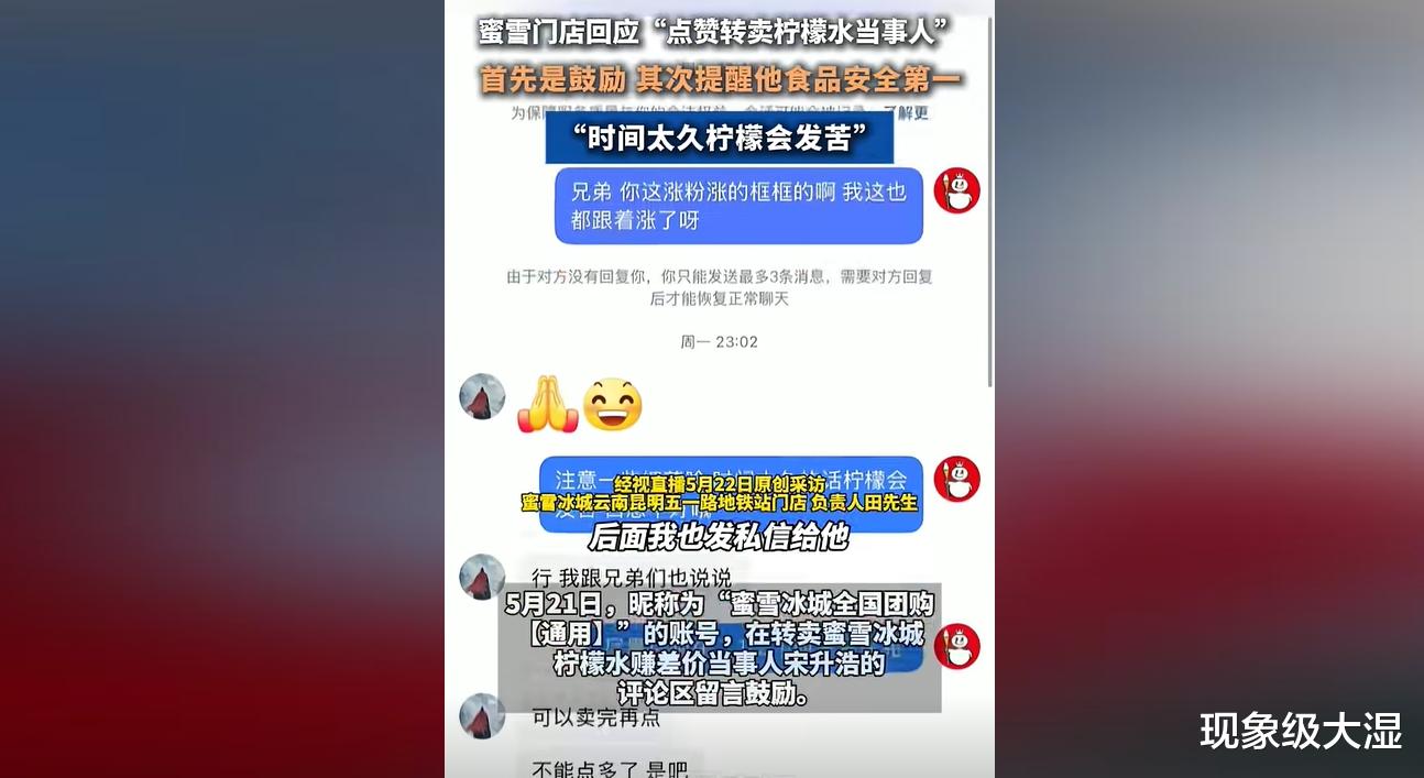5月20日,蜜雪冰城客服回应,已记录相关情况,将反馈给公司相关部门,后续由专人核实是员工出店售卖还是他人转卖。5月21日,事件当事人发布视频讲述事情经过,称拍摄倒卖柠檬水视频初衷是为粉丝做低成本摆摊创业实操示范,并非盈利。随着事件发酵,专业法律人士解读该行为未构成侵权,让其放下心来,他感慨开展商业活动要以“不侵犯他人权益”为首要前提。
