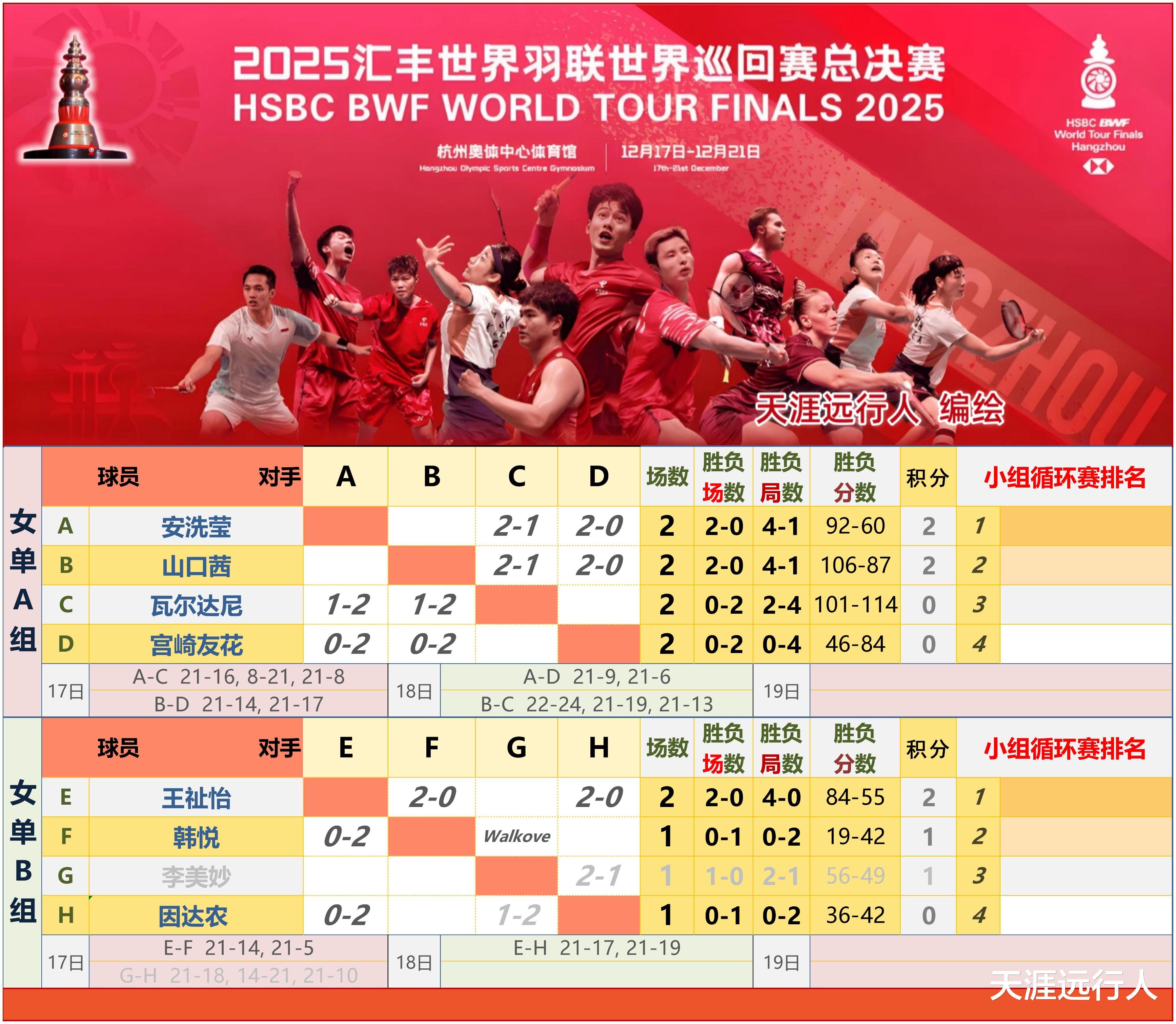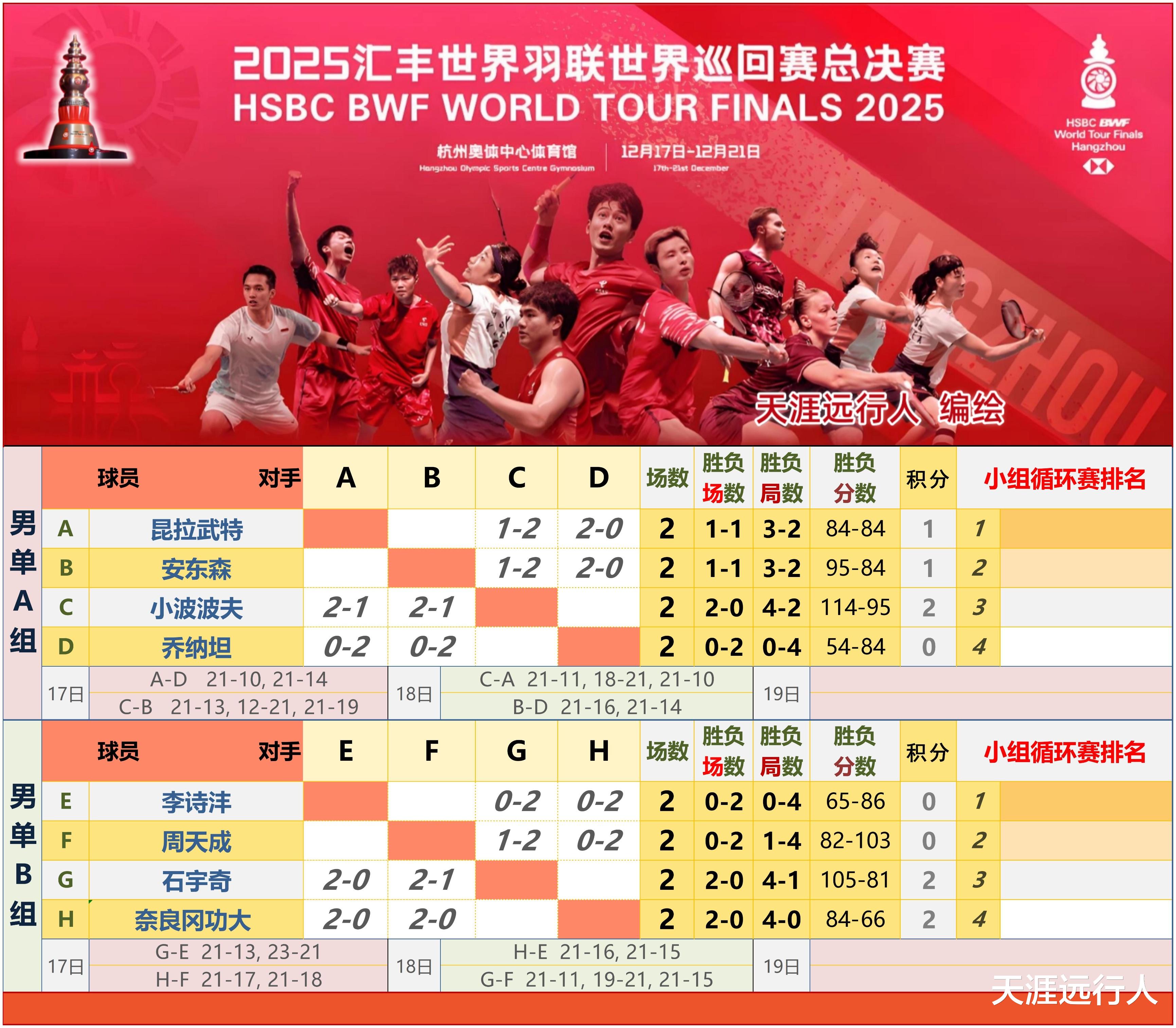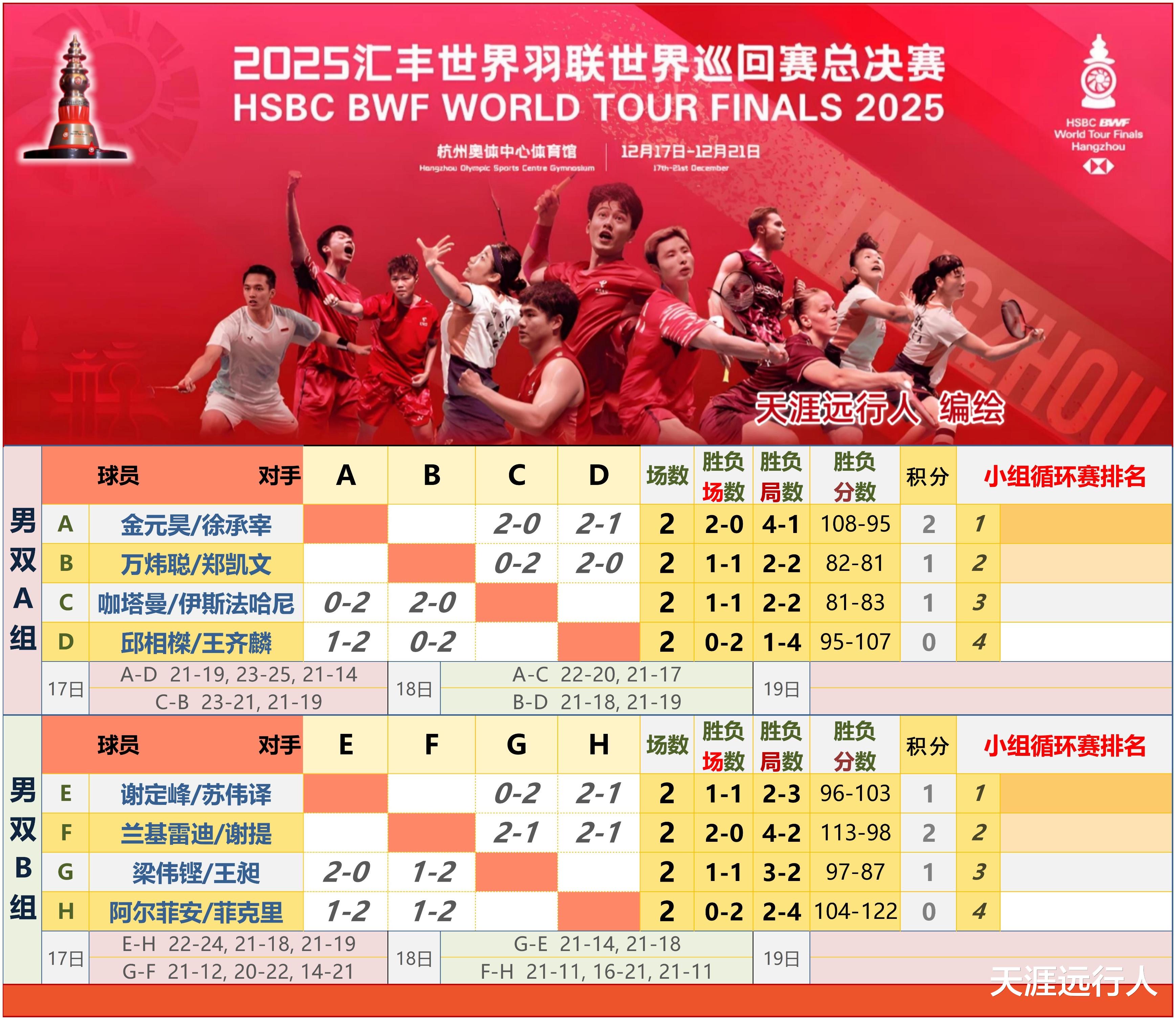 北京时间12月18日22时25分,2025杭州世界羽联年终总决赛小组赛阶段第二比赛日,五个单项第二轮的20场角逐,全部决出了胜负。