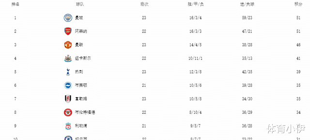 现在英超积分榜曼城与阿森纳均为51分,不过值得一提的是阿森纳少打了1场比赛,若补赛能得分,仍能回到英超榜首。不过目前阿森纳在近三场比赛中还未夺冠,三轮一分,这成绩实在是太差了。