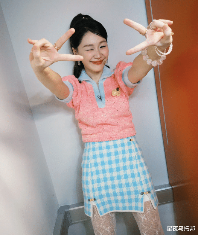 粉色上衣搭配蓝色短裙,白色丝袜上身,胳膊上还带了白色手串点缀。