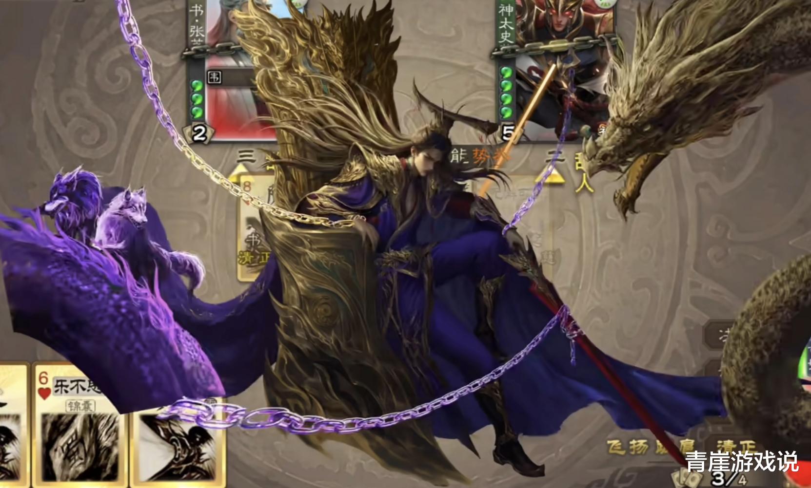 此时身边的紫色恶狼环绕,显得非常有活力,和这条苍龙形成对比。司马家族隐喻的则是这群狼,从司马懿、司马师再到司马昭,一步一步蚕食着曹魏集团的势力,此时曹髦无奈、隐忍,时刻准备着爆发。