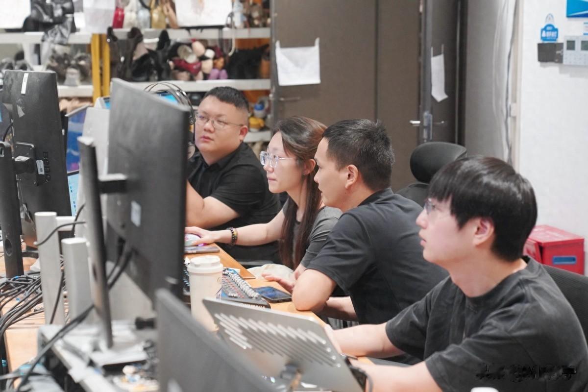 每个直播间都配有中控、场控、助播、运营、导摄等十几个人,大家各司其职,配合默契,就像运行精密的齿轮,一环卡一环,忙碌而有序。急促敲击的键盘、高亢有引导性的话术、实时更新的后台数据……