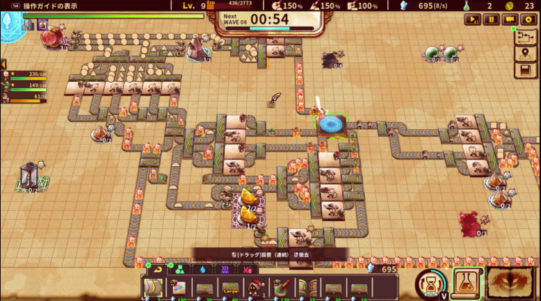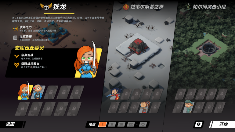 而开发者会如此设计游戏,就是希望整个游戏像是精准的符号学一样去传递游戏过程的信息。而这么做的目的,自然是希望玩家把注意力转移到决策层面上,游戏提供了一个技能树系统,甚至像是提前放下一波兵进来的系统功能都被放到了这里面去解锁。每次完成一局游戏就可以获得一些加点,然后根据自己的想法解锁相关内容,同时别看前面的关卡结构很简单,甚至肩负了教学任务,但并不意味着你随便打打就能过去,你需要反复死亡并带着已经击杀的成绩换取技能点去解锁更多技能,然后再回来继续挑战,如此循环就可以推的更远。