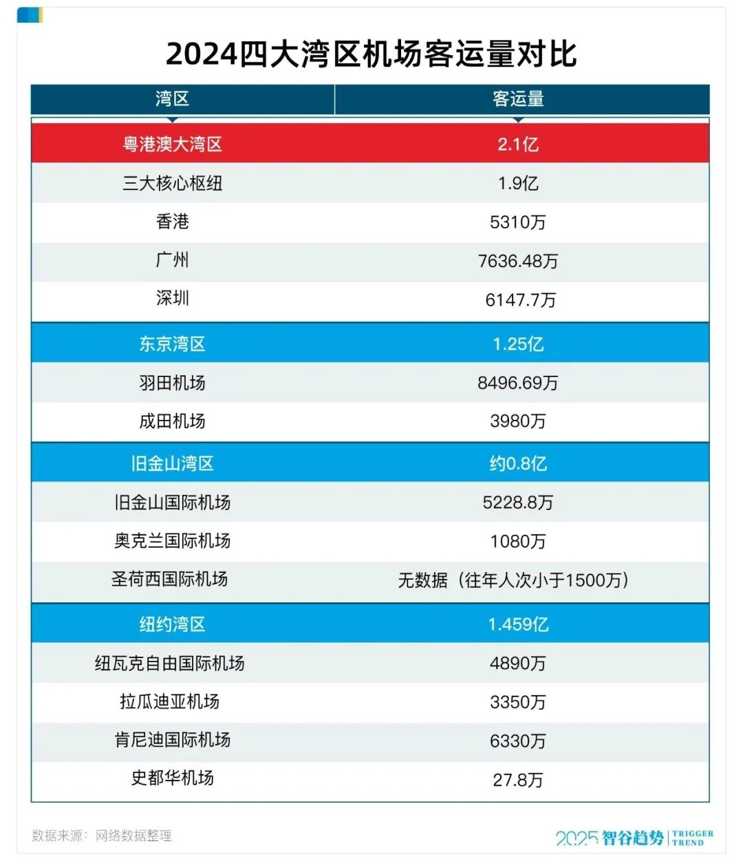2024年,大湾区7座机场旅客总吞吐量突破2.14亿人次,远超其他世界级湾区。