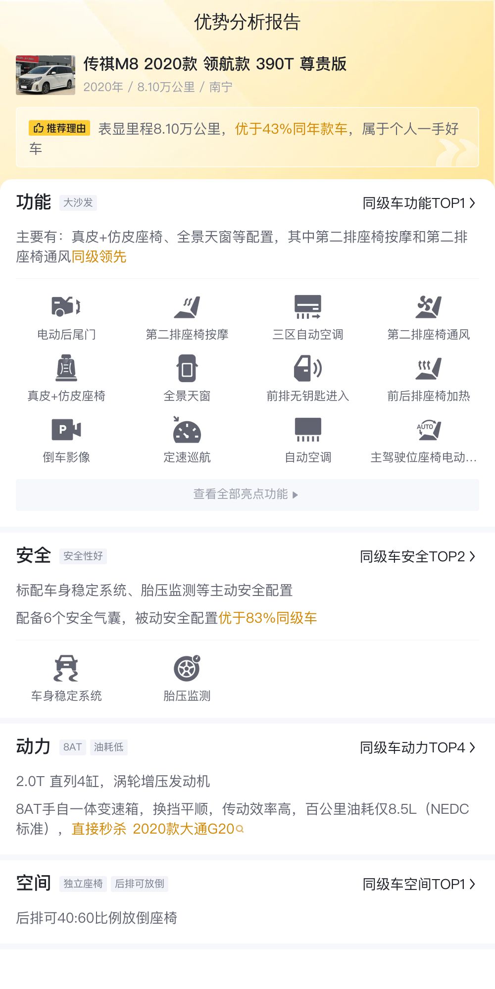 这款传祺M8 2020款 领航款 390T 尊贵版的优点是在配置方面比较丰富,例如全速域ACC自适应巡航、L2级驾驶辅助、360度全景影像等等,在这个价位的MPV车型中不多见。同时8AT的手自一体变速箱在日常使用中发挥的也很稳定。缺点方面我认为集中在动力部分,不是说2.0T的动力不够用,而是传祺M8的整备质量较大,所以百公里8.5L的油耗就显得有些高了。