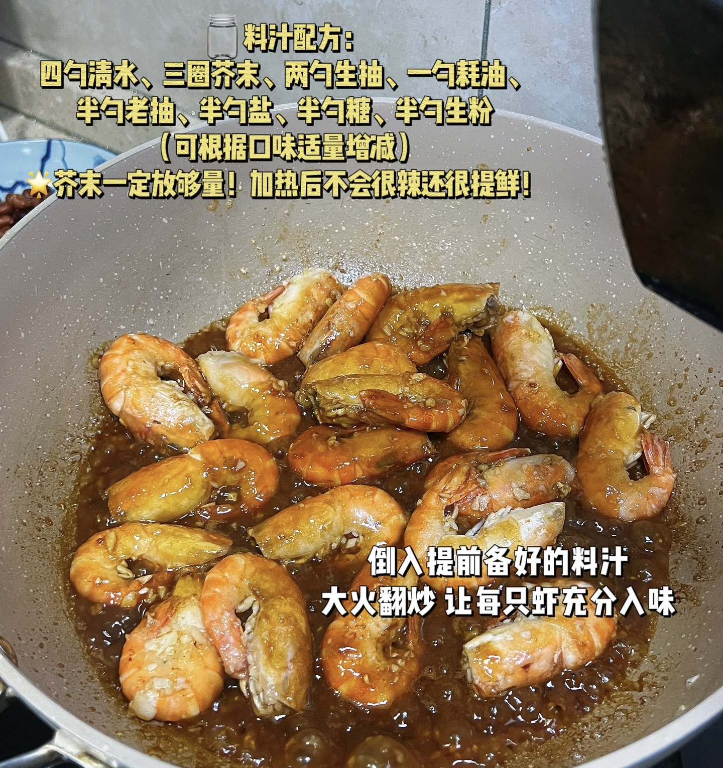 烹饪方式分为油炸与焖煮两种,家庭操作推荐焖煮法,更易掌握且保留虾肉嫩滑。热锅倒油,油热后放入虾,中火快速翻炒至虾身变红、微微卷曲,捞出备用。锅中留底油,加入蒜末、姜末爆香,倒入调好的芥末酱汁,小火煮至微微冒泡、香气四溢。随后将炒好的虾倒入锅中,翻炒均匀,让每一只虾都裹上酱汁,再加少量清水,盖上锅盖焖煮3—5分钟,使虾肉充分吸收风味。最后开盖收汁,汤汁浓稠即可出锅。