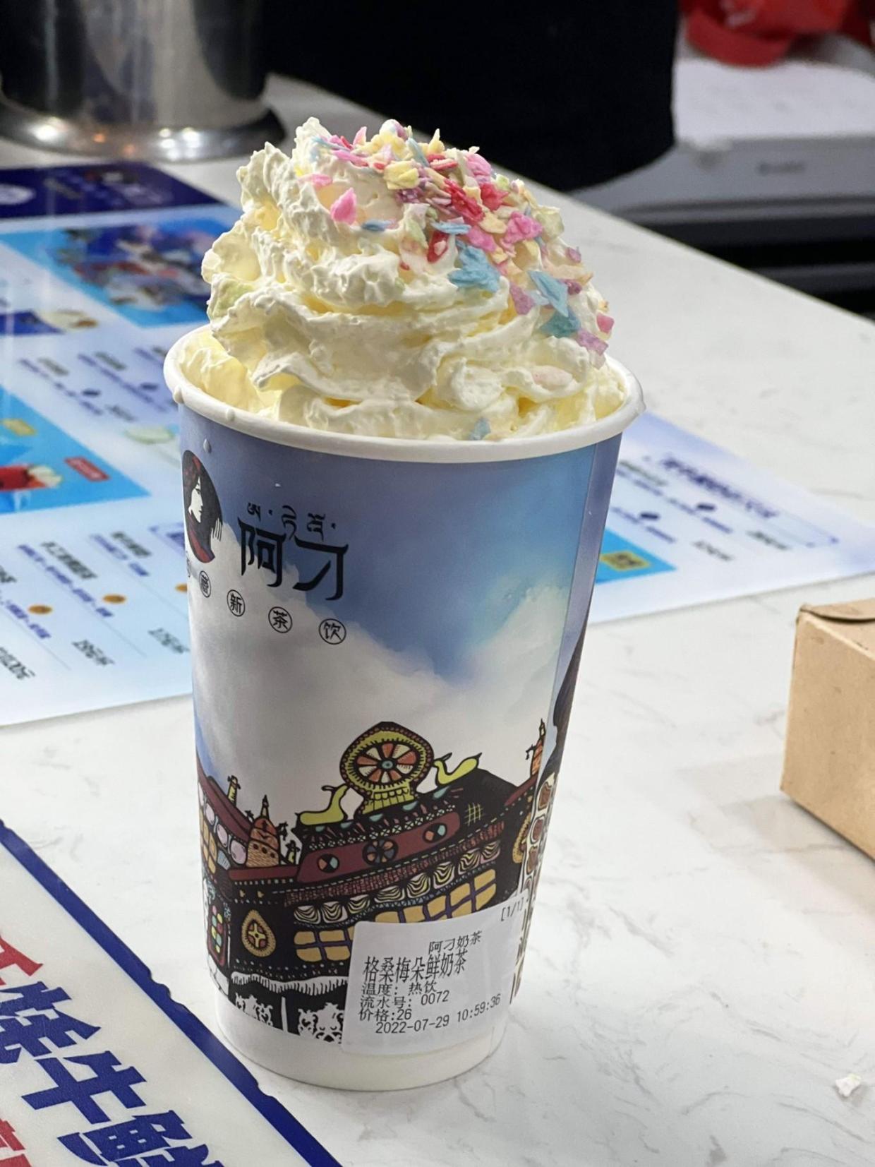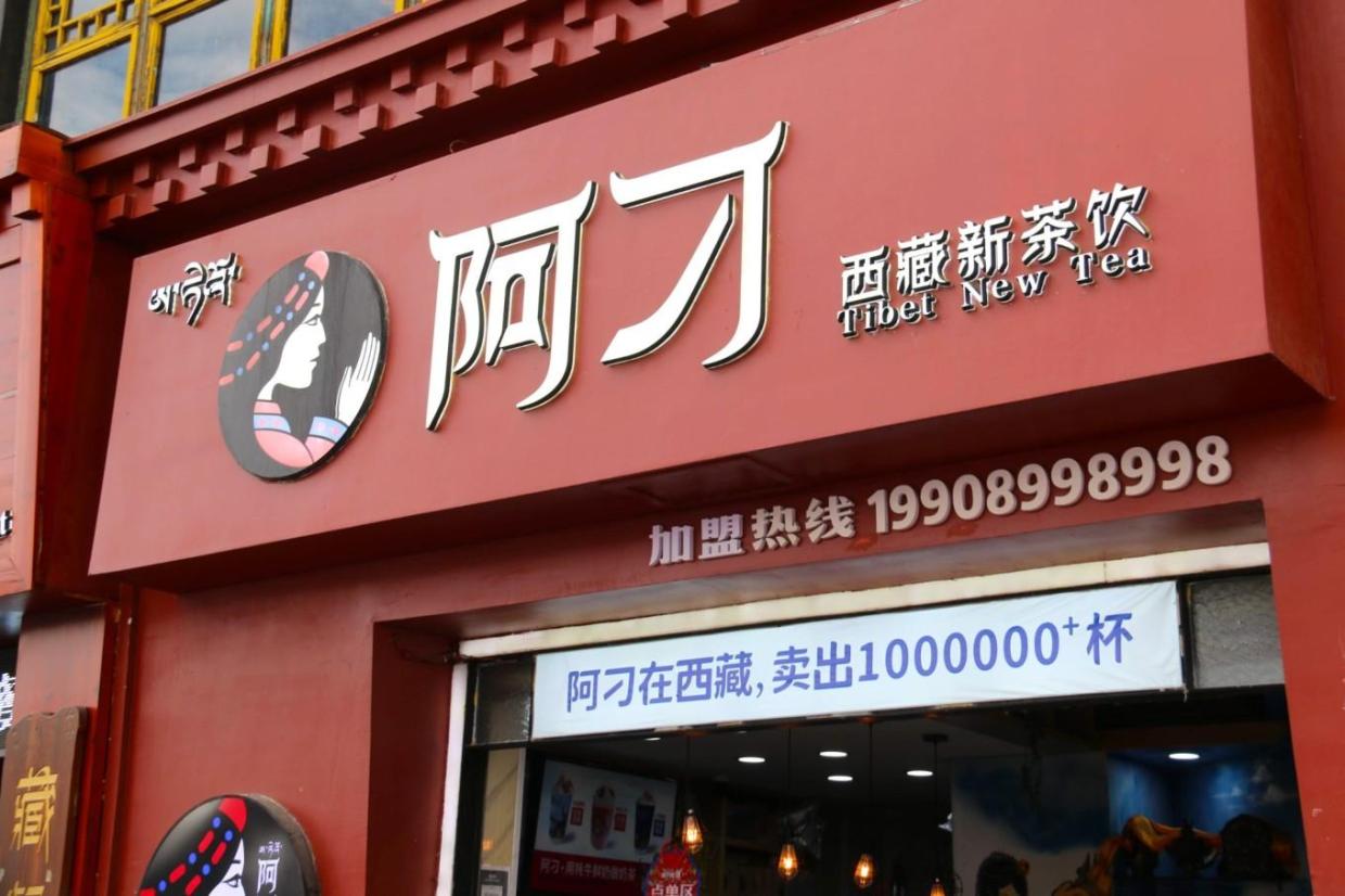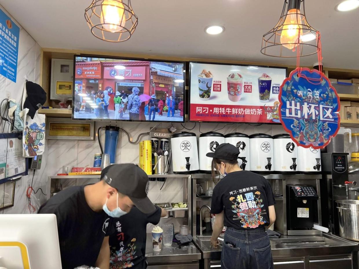 街道多是商业门面,旅游产品占据大多数,这家阿刁的奶茶店门口聚集大量的游客,也排起长长的队伍。层出不穷的新式藏式奶茶的出现,也代表古老的藏族文化的新面貌,走出高原走进全国各地。