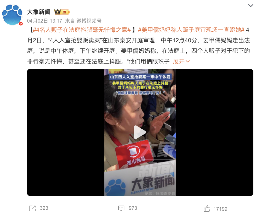 昨天,此事在山东泰安开庭审理,4个人贩子云淡风轻,甚至还在法庭上瞪受害者家属,威胁之意溢于言表。