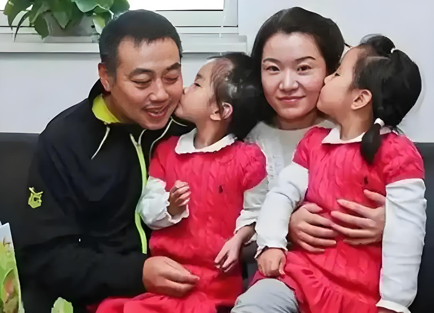 (刘国梁与父亲、妻子、双胞胎女儿)