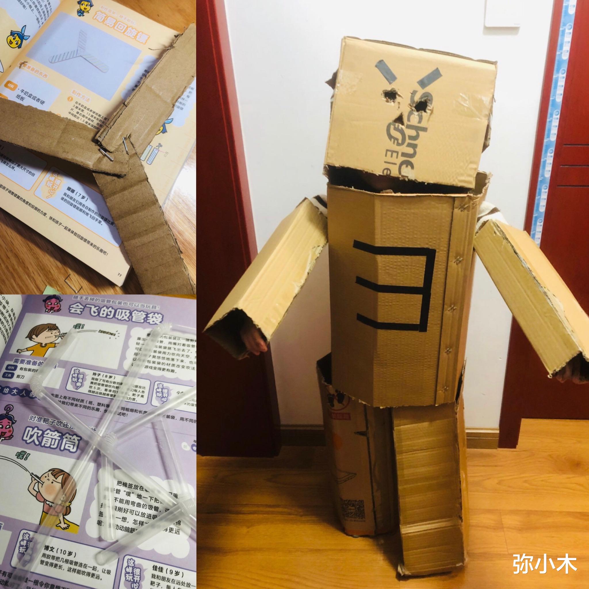 《儿童游戏图鉴》中适合小学生玩的DIY玩具有很多,比如“会飞的吸管袋”、“自制回旋镖”、“纸箱机器人”……