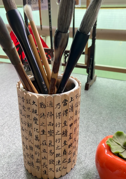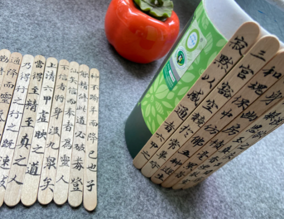 如果会写毛笔字的话,可以在雪糕棍上面写上毛笔字,然后再把它们粘贴在茶叶盒的外面。
