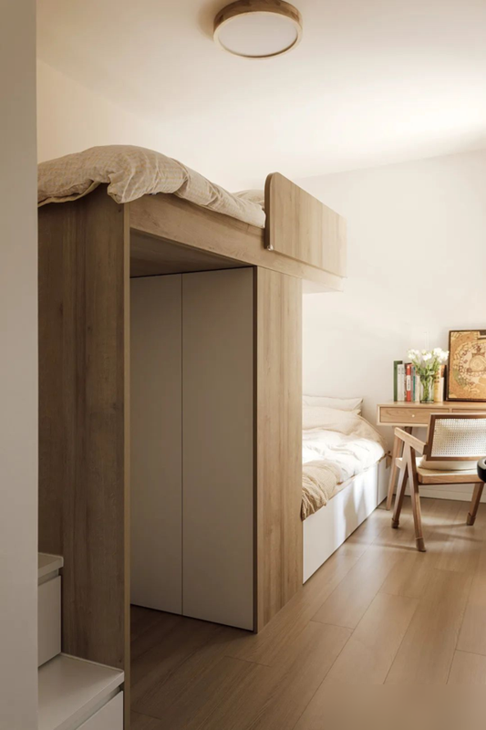 最绝的是错位上下铺,比传统高低床省地儿不说,台阶还能藏玩具杂物,带娃家庭简直捡到宝。