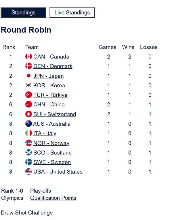 本届世锦赛是最后一届13支队伍的大循环赛事,依旧按照循环赛前6名晋级淘汰赛的办法,其中前两名直接晋级半决赛,第3-6名进行附加赛,胜者晋级四强。目前积分榜排名为:加拿大两连胜,丹麦、日本、韩国、土耳其、开门红,中国、瑞士1胜1负,澳大利亚、意大利、挪威、苏格兰、瑞典、美国1负。