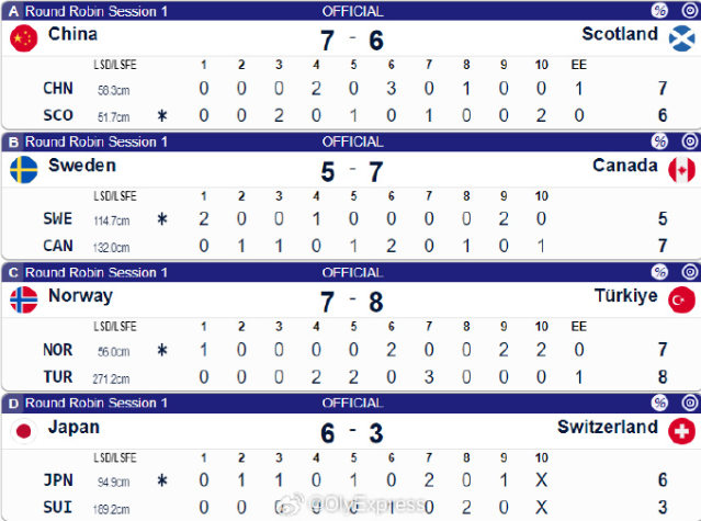 【中国7-6苏格兰】首场比赛替补苏亭毓顶替董子齐出战。前两局双方试探读冰,0-0均交白卷;第三局苏格兰队凭借牵制拿2分,第四局韩雨精准入营旋粘,中国队扳回2分,第五局对手拿到1分,上半场苏格兰3-2领先。第六局中国队布局完美,成功拿下3分反超,第七八局各自得到1分后,第九局再次互交白卷,第十局瑞士后手惊险拿到2分,成功追到6-6的平局。附加局中,韩雨关键一投险胜,最终中国队7-6绝杀对手,迎来开门红。