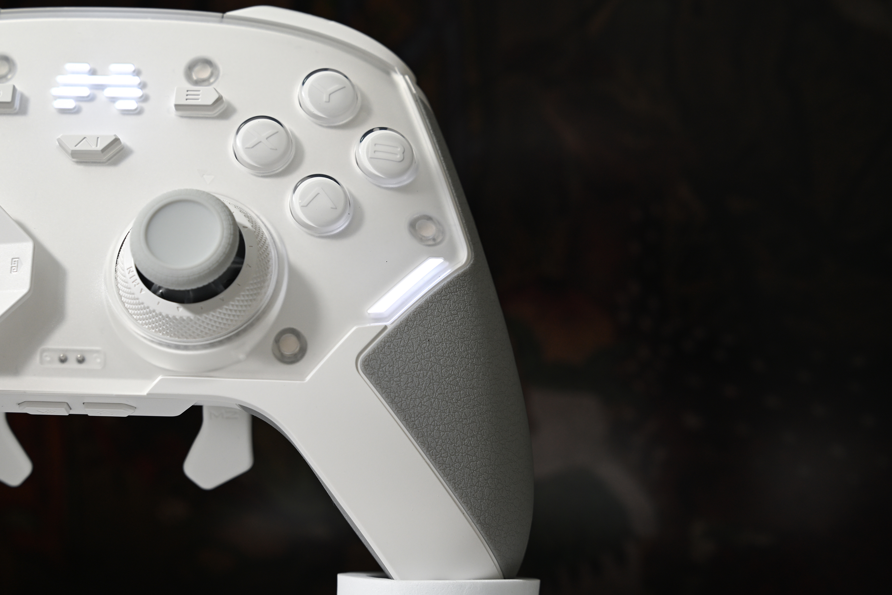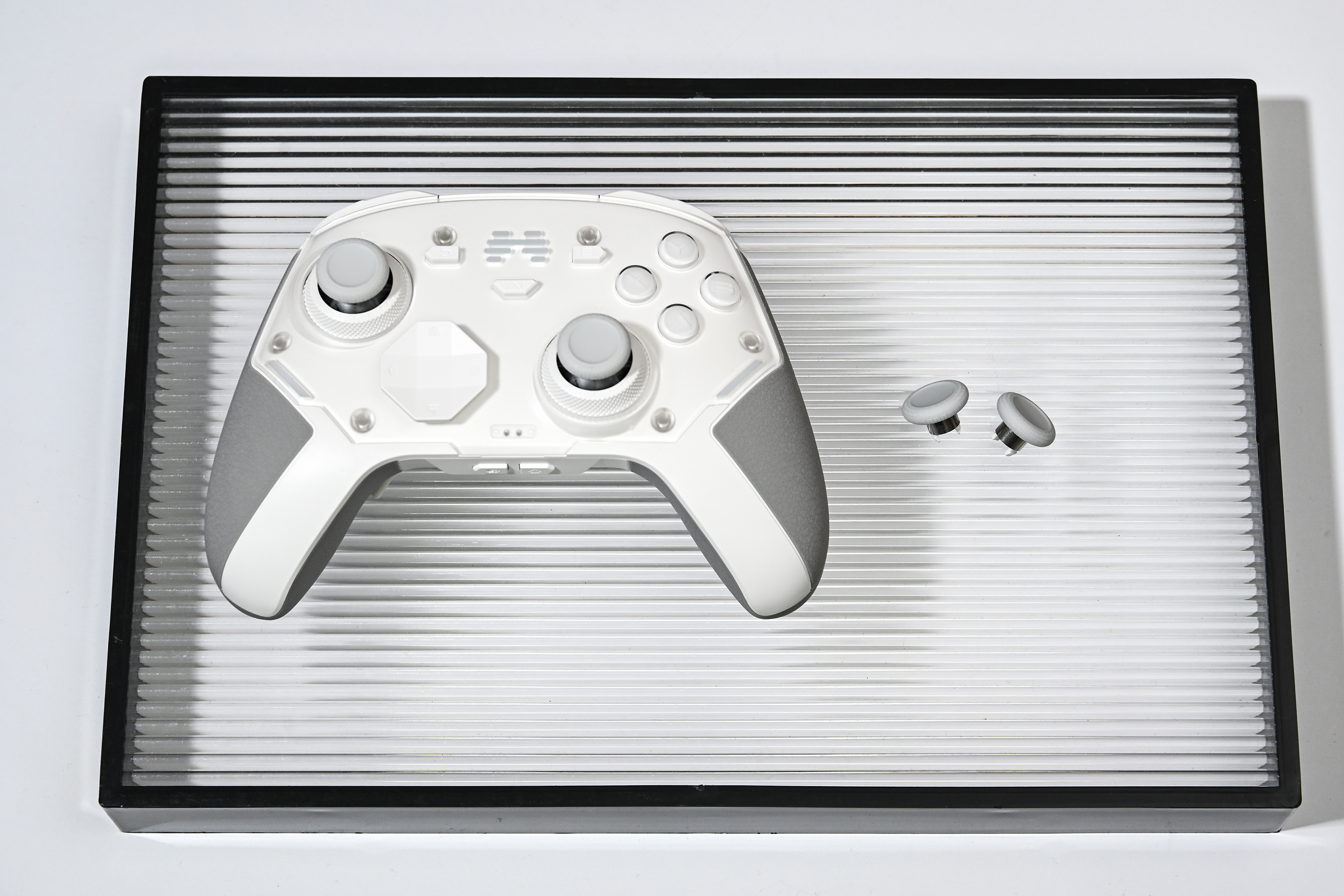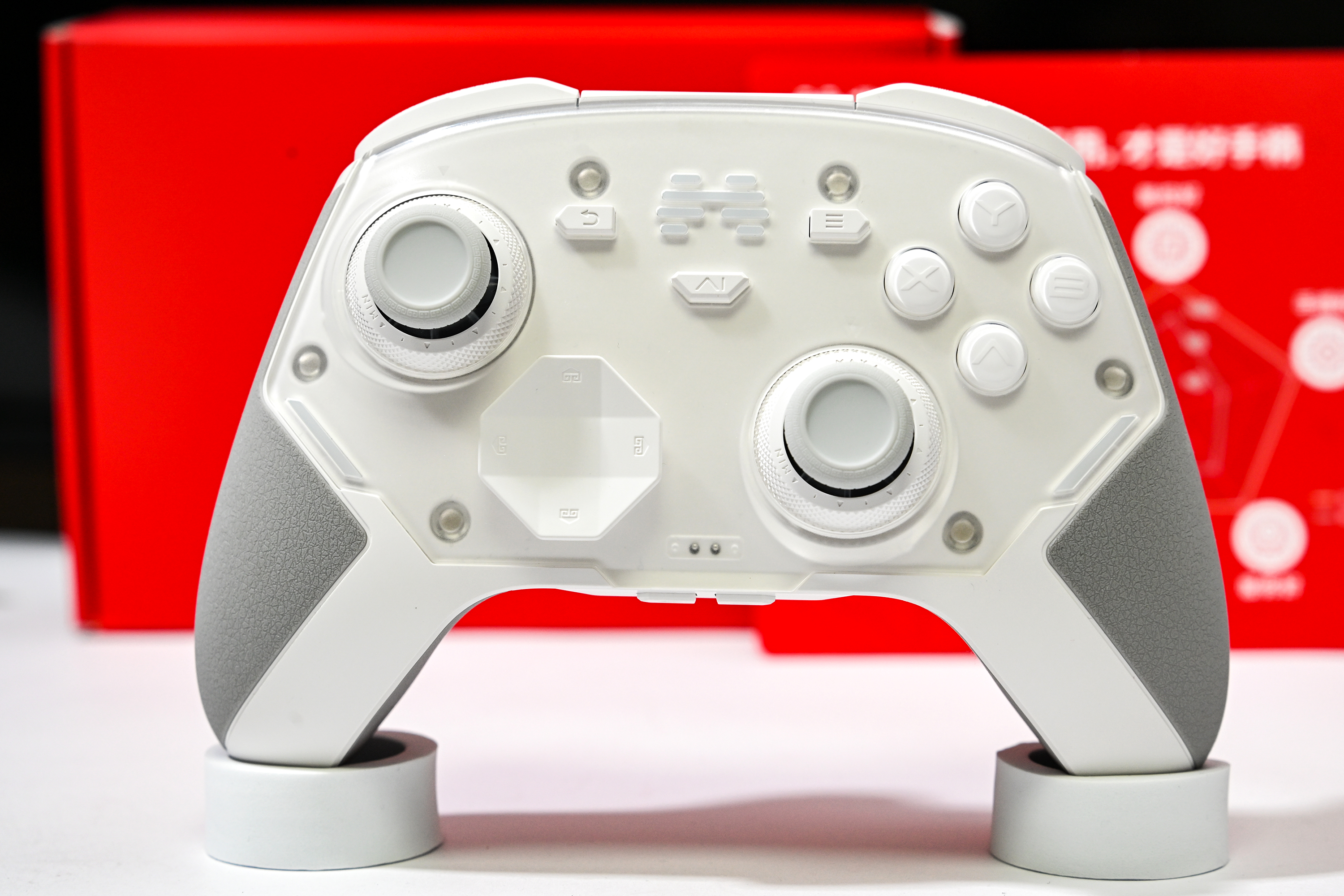 手柄采用了非对称摇杆布局,按键区域采用了磁吸式透明磨砂面板,可自行自定义更换,左右两侧为精英皮纹包胶握把,触感细腻,有效防滑防汗,仿生设计,不挑手,长时间握持同样舒适。