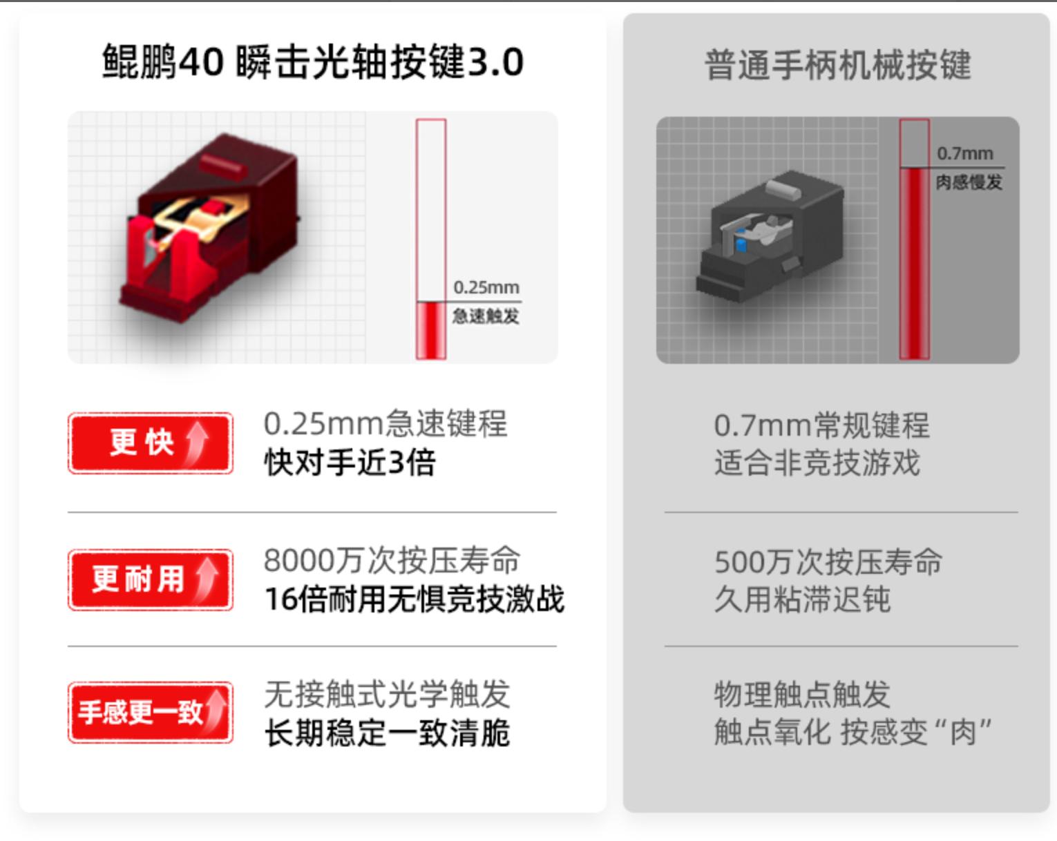 ABXY键采用透明光微动设计,提升视觉质感。搭载光轴按键3.0,压力克数60gf,键程仅0.25mm,触发迅捷、手感清脆。光学触发方式保证每颗按键手感一致,寿命更高达8000万次。
