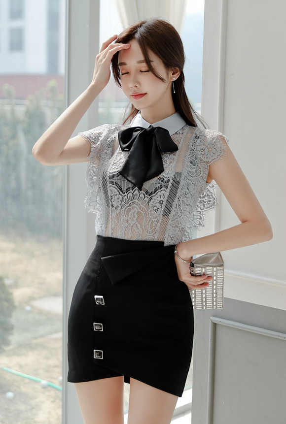 女孩上身穿着一件别致的蕾丝上衣。领口处的白色衬里犹如点睛之笔,为整体增添了一丝清新与利落。领口之上,黑色大蝴蝶结翩然绽放,既带着少女的俏皮,又不失优雅气质。蕾丝材质细腻且精致,镂空的花纹若隐若现地透出肌肤,营造出一种含蓄的性感。短袖的设计露出纤细的手臂,蕾丝花边的袖口增添了几分柔美。