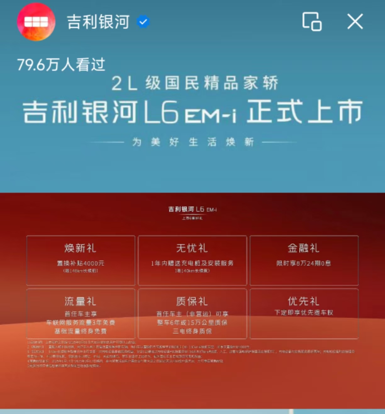 2 月 13 日讯,在竞争白热化的汽车市场中,吉利银河 L6 EM - i 强势登场,以 7.98 万元起的限时先享指导价,瞬间抓住了众多消费者的目光。
