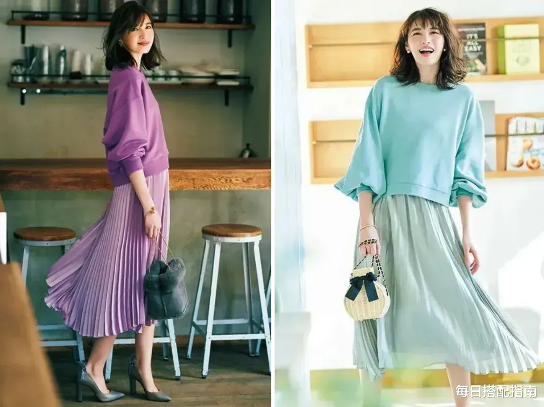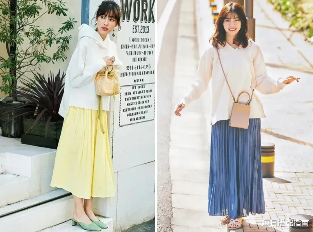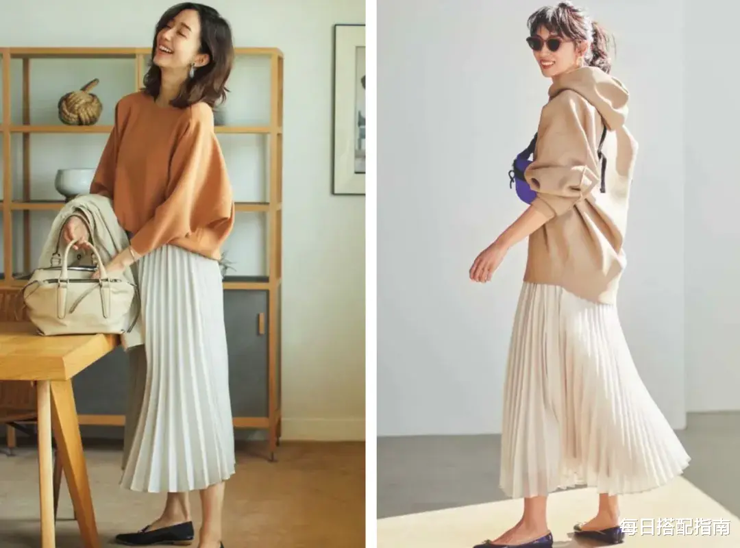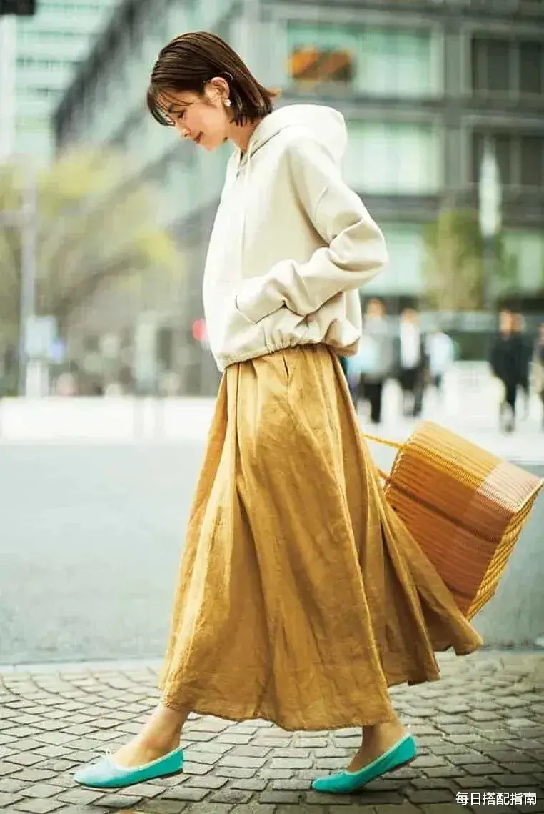 ✨ 核心公式:宽松卫衣(长度盖臀)× A字裙(裙摆宽≥卫衣下摆1.2倍)🎯 关键技巧: 营造上松下紧的黄金比例,让整体造型轻盈又有层次。