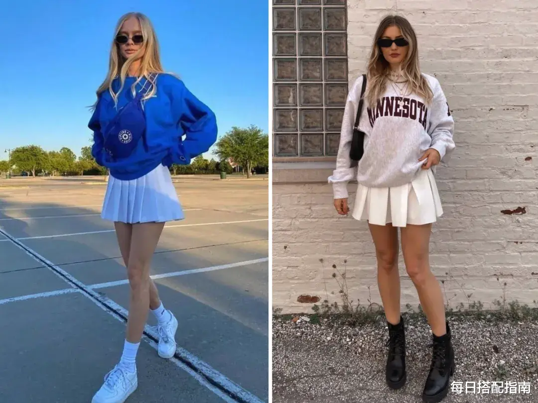 💡 进阶技巧:✔ 中筒袜(高度=小腿肚中点)——强化学院风氛围,增加造型的层次感。✔ 卫衣下摆半扎——露出部分腰线,优化比例,避免造型“下沉”。