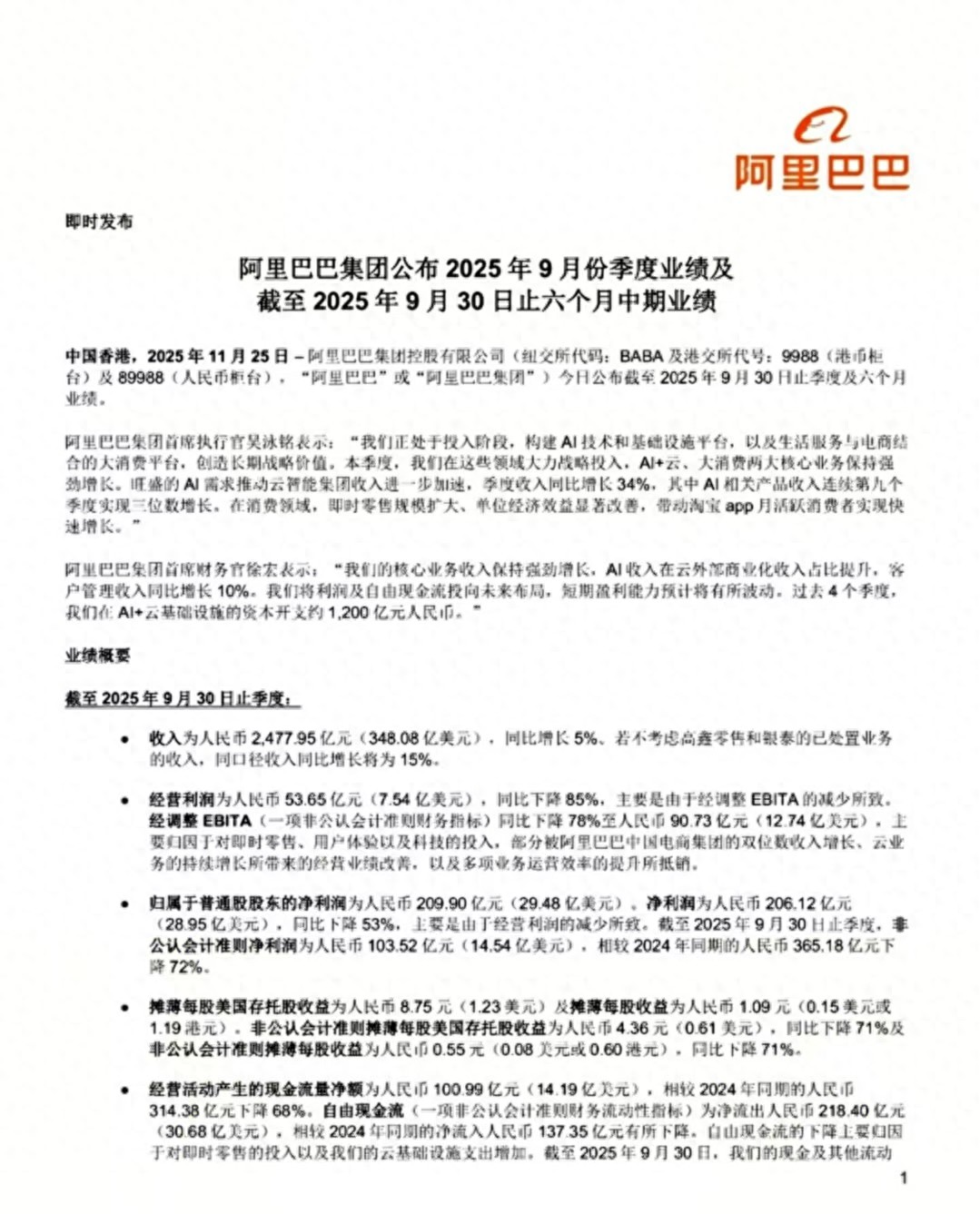 2025年深秋的这份财报,对于阿里巴巴而言,与其说是一份“成绩单”,不如说是一份“病危通知书”与“新生通过令”的合订本。