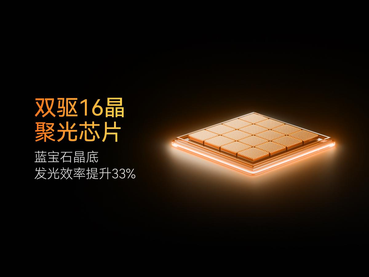 双驱16晶微米级聚合光芯,相比八核发光芯片,同单位体积下,发光效率更高,发光点更精细,细节更加清晰细腻,亮得更耀眼,暗的更深邃,画质还原更加真实。
