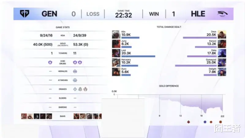 这GEN压根就没有把KeSPA杯当一回事,当家的Canyon,Chovy和Ruler都没有参加比赛。结果就是GEN被日本,越南,LCK队伍轮番欺负。20分钟,HLE轻松攻破GEN上路高地;最终22分32秒,HLE轻松一波。