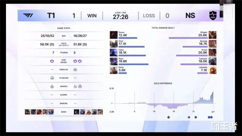 结果这一局比赛,双方各打了半场好局,T1利用经验笑到了最后。比赛前期NS打出优势,比赛第10分钟NS小龙团打出0换2后一度7-2开局;比赛第20分钟左右,两队在河道爆发混战,T1抓到机会打出1换4大胜逆转前期劣势;比赛第23分钟左右,T1野区打出2换4后拉开经济差;最终比赛第27分26秒,Oner潘森砍下三杀,T1一波团灭NS结束比赛。