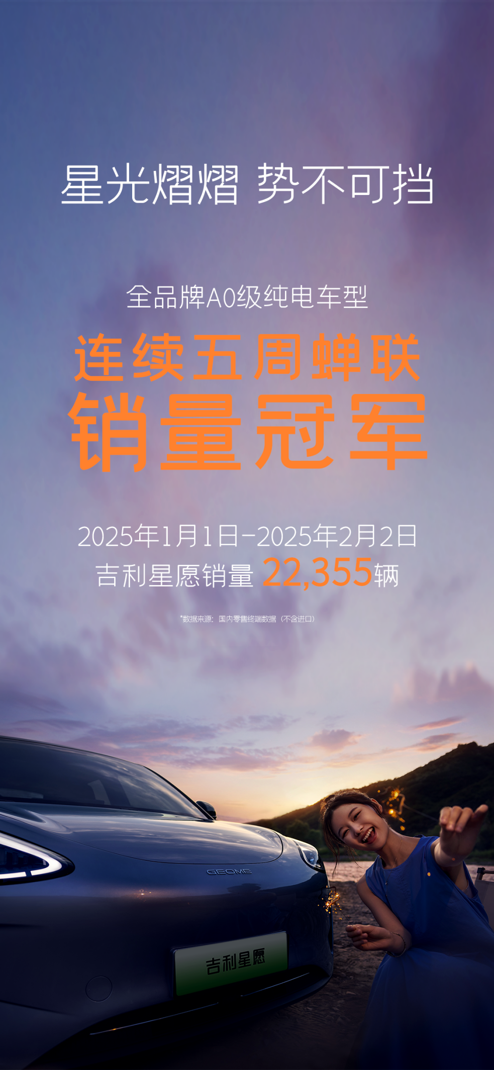 在 2025 年开年,车市的竞争格局正悄然发生变化,吉利星愿宛如一匹黑马,在 A0 级纯电小车市场中脱颖而出。自 2024 年 10 月 9 日全球上市后,它不断突破交付速度,2025 年前五周更是以亮眼的销量成绩,连续五周霸榜全品牌 A0 级纯电车型销量榜,将比亚迪海鸥以及五菱缤果等老牌劲旅甩在身后。