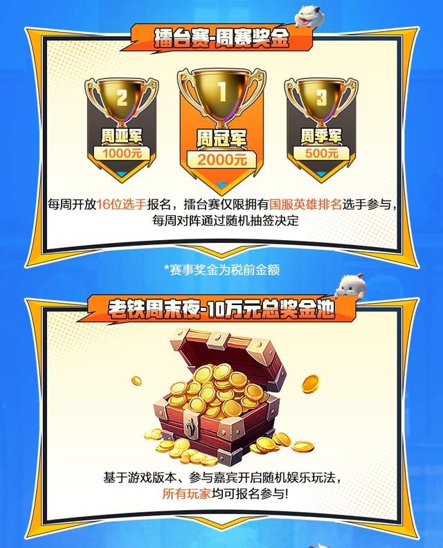 除了比赛奖金,官方还为观众准备了丰富的观赛福利。比赛日的每晚21:00,观众们可以在直播间中参与抽奖,有机会获得传说皮肤、宵夜红包、奶茶红包以及赛事周边等丰厚奖励。而在老铁周末夜,官方更是为玩家准备了总奖金池高达10万元的娱乐玩法,并且所有玩家都可以报名参与。