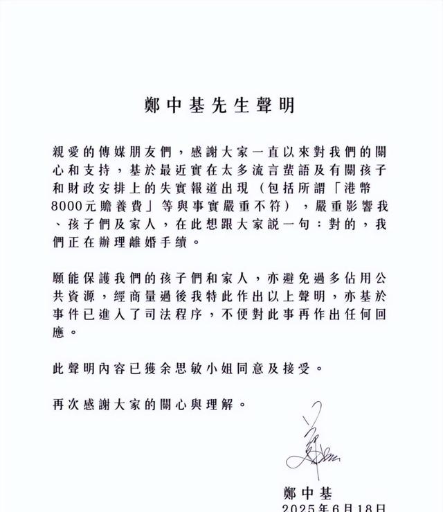 这些言论已经严重影响,他与孩子及家人,他只承认目前正在办理离婚手续。显然郑中基的一则声明,仍堵不住传媒的好奇心。
