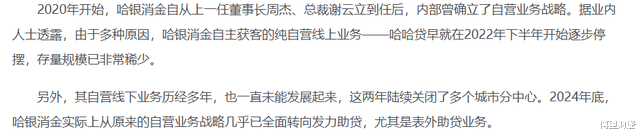 在时任董事长周杰和总裁谢云立的领导下,哈银消金确立了发展自营业务的战略方向。然而,这一战略并未能持续深入推进。据《智瑾财经》报道,有业内人士透露,哈银消金自主获客的纯自营线上产品——“哈哈贷”早在2022年下半年就开始逐步停摆,存量规模已非常稀少。同时,其自营线下业务也发展不顺,近年来陆续关闭了多个城市分中心。